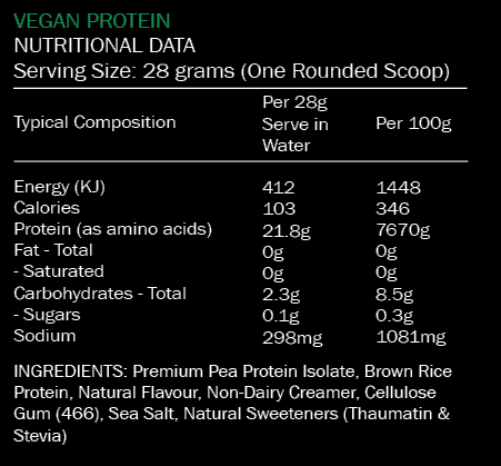 A special blend of premium plant proteins provides an optimal amino acid profile, which is superior to any single plant protein source. Pea Protein is low in the amino acids cysteine and methionine, but rich in lysine, so it blends perfectly with rice protein which is low in lysine, but super-high in cysteine and methionine.