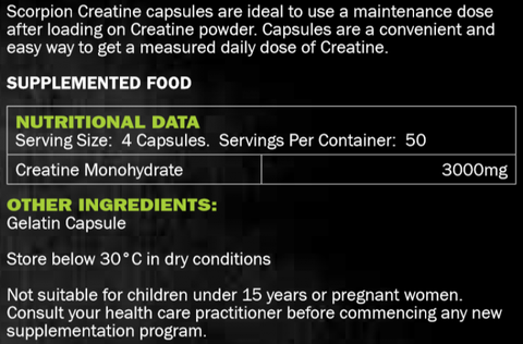 Scorpion Creatine Monohydrate capsules supply high quality 200 mesh pure micronised creatine for maximal absorption and effectiveness that helps support increases in strength, power and muscle growth.